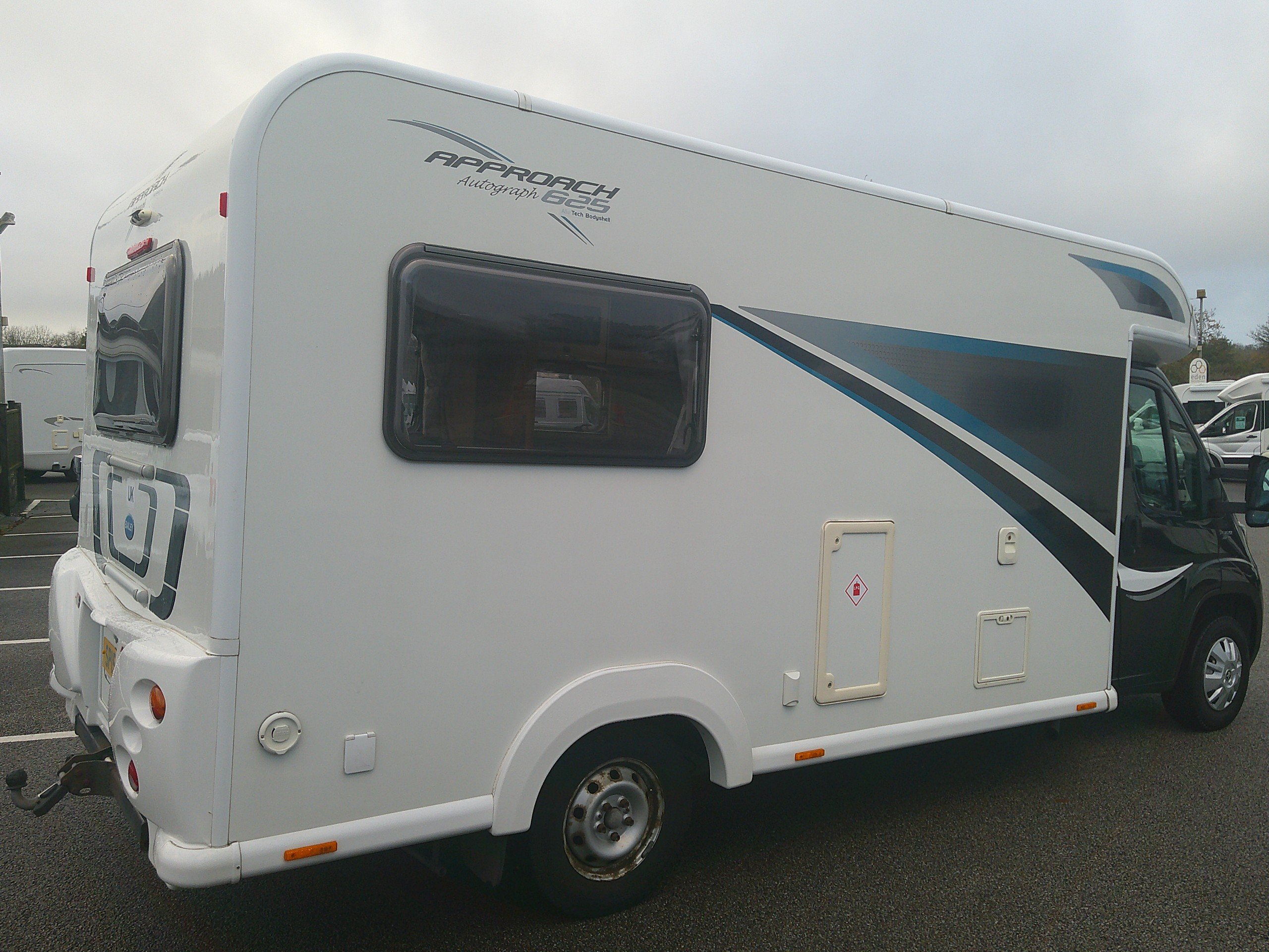 This 2 berth Bailey Approach Autograph 625 is base don the 130BHP Peugeot chassis. The layout consists of an end lounge, side kitchen, bathroom with a separate shower, swivel cab seats. The spec consists of an Alde system for the heating and hot water, full oven, microwave, 3 way fridge, control panel, leisure battery, water tanks, blinds and flyscreens, solar, TV aerial, awning, towbar, rev camera. -
