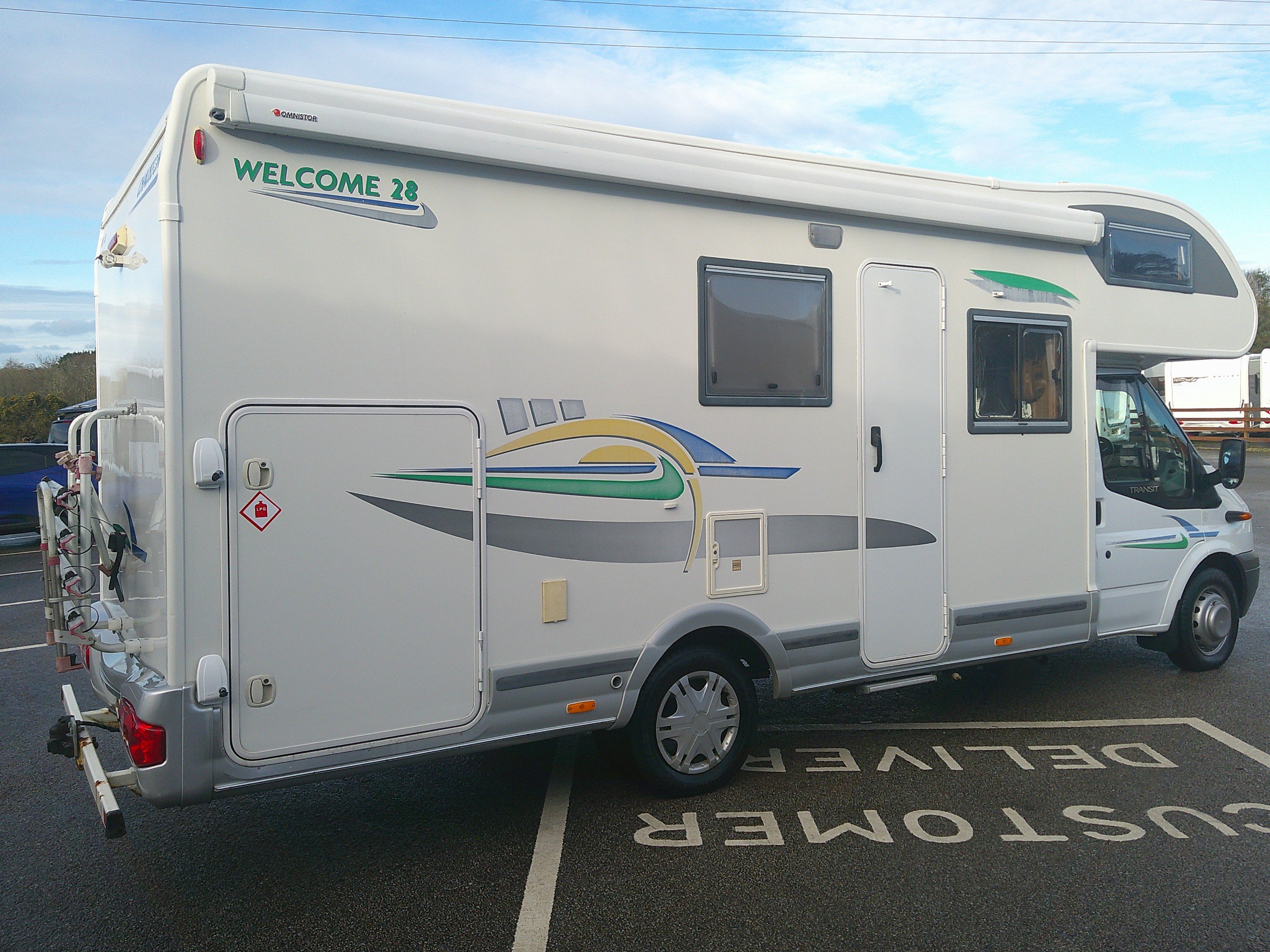 This 6 berth Chausson Welcome 28 is based on the 2.4td Ford chassis which produces 140BHP. The layout consists of an end large garage with a double over the top, bathroom with a separate shower, side kitchen, half dinette seating with 2 three point seat belts, side bench seat with a lap belt, swivel cab seats, large overcab bed. The spec consists of heating, hot water, 3 burner hob, oven/electric airfryer, 3 way fridge, water tanks, leisure battery, entrance step, rev camera, TV aerial, bike rack, awning, twin wheels at the rear. currently on a 3850KG chassis, can be replated to 3500KG for PLG and non C1 license holders. -