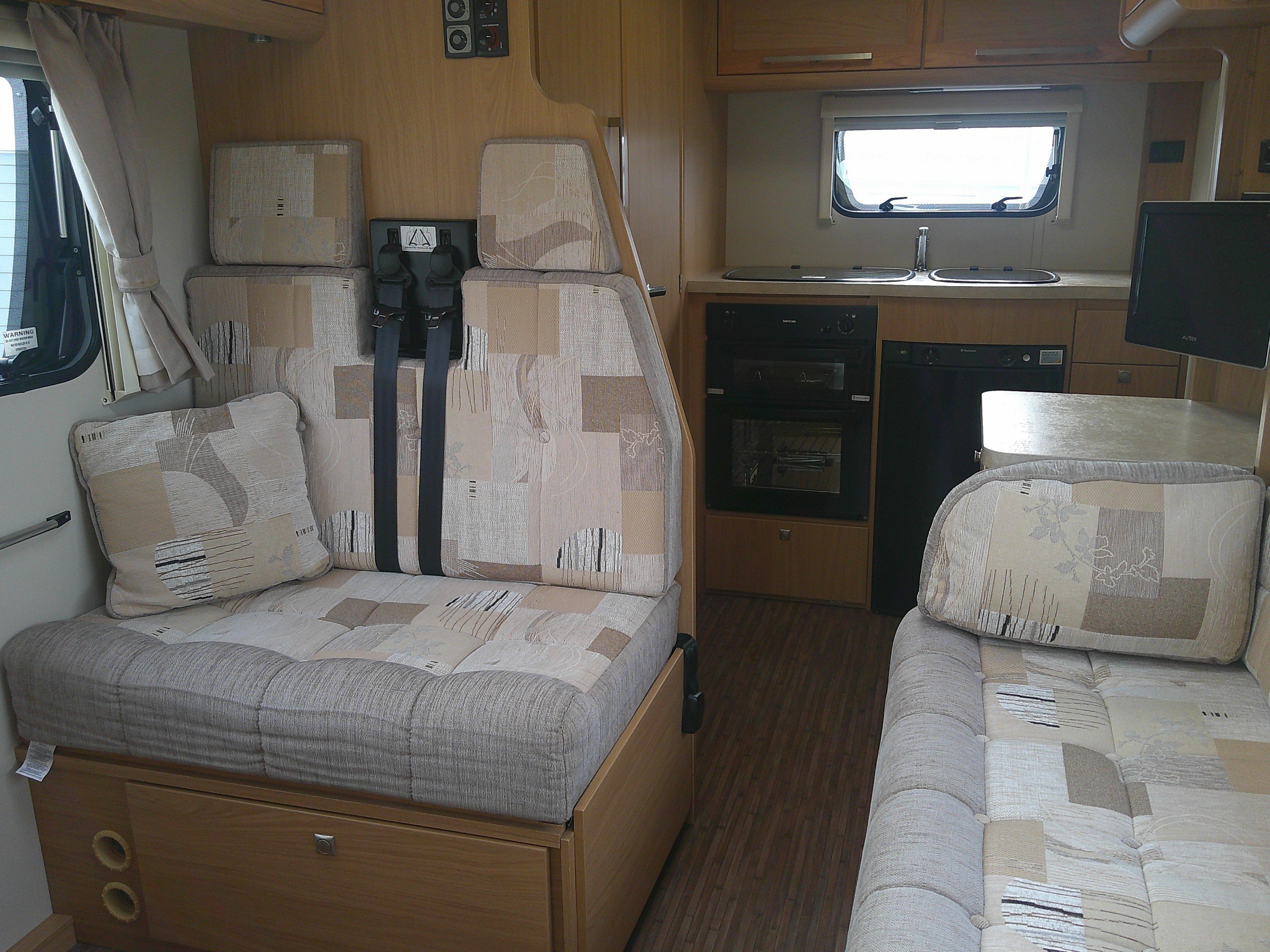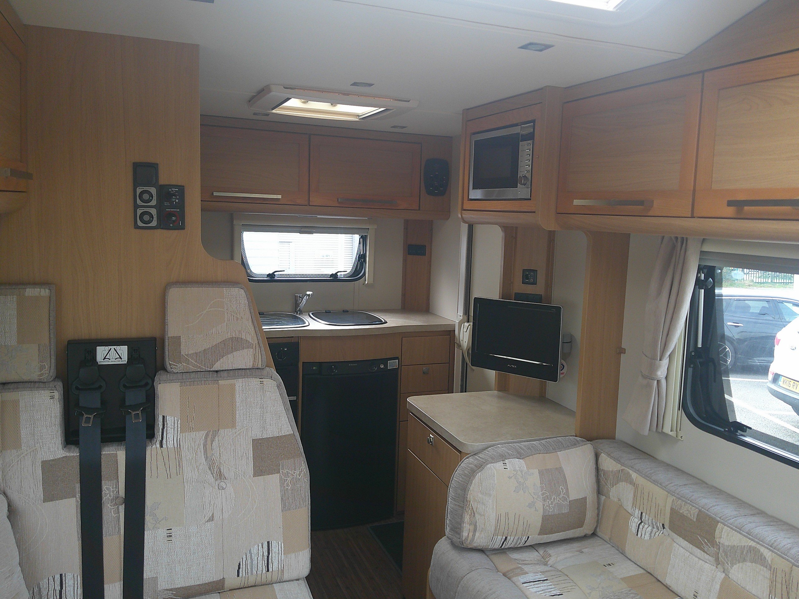 This 5 berth Elddis Majestic 130 is based on the 110BHP Peugoet chassis. The layout consists of an end kitchen, corner bathroom, double dinette with 2 rear seatbelts, bench seat, overcab double bed. The spec consists of heating, hot water, full oven, 3 way fridge, water tanks, leisure battery, control panel, entrance step, lights, blinds and flyscreens, TV aerial, awning, bike rack, cab A/C, cruise control, multi function steering wheel. -