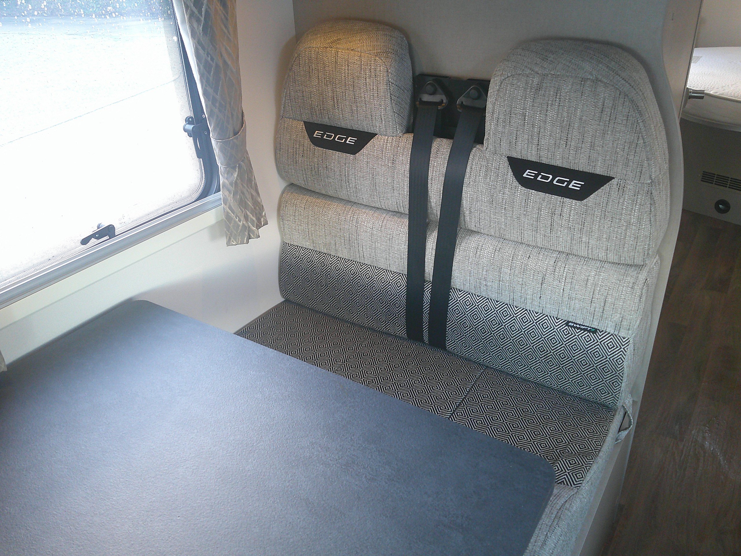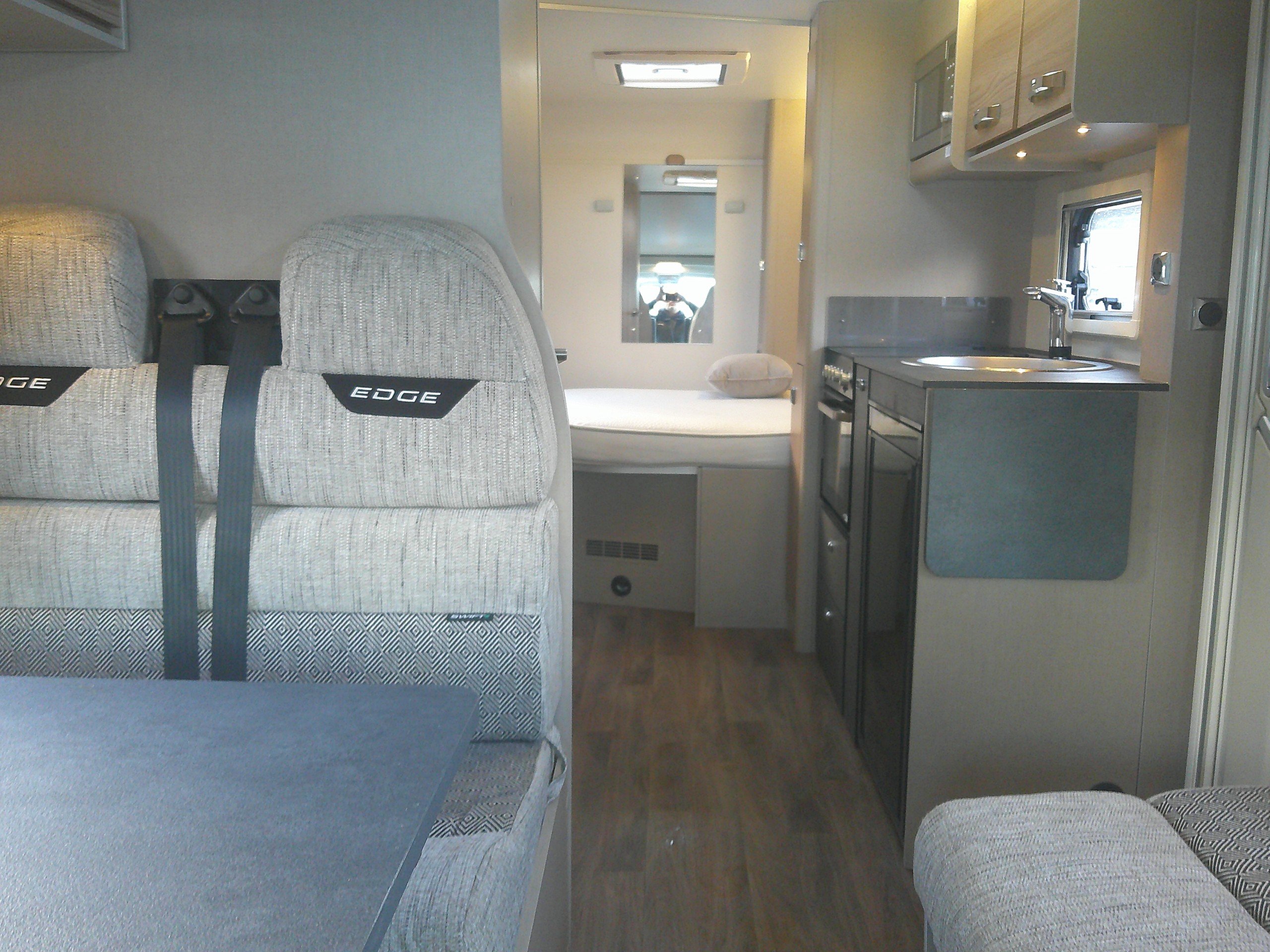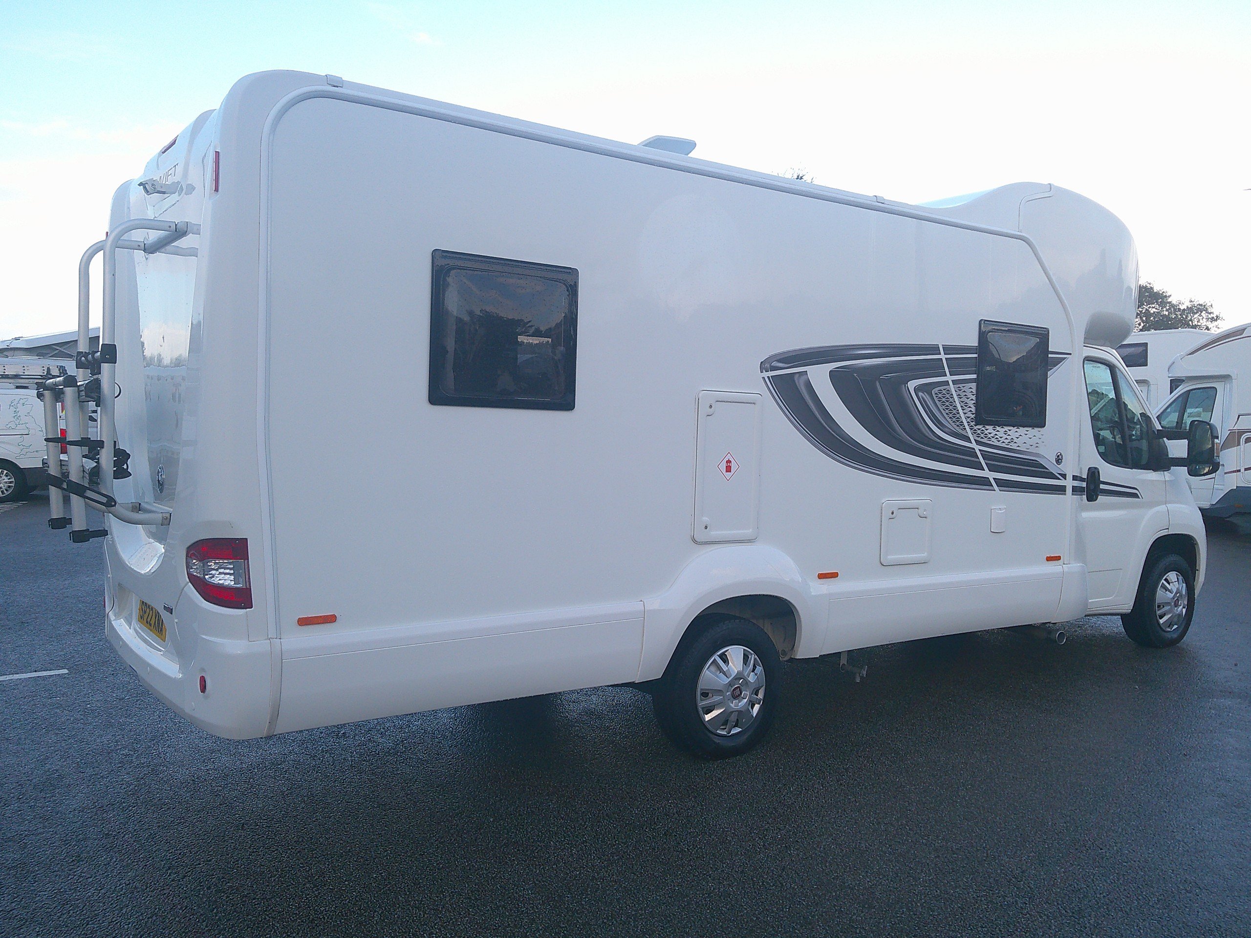 This 4 berth Swift Edge 494 is based on the 120BHP Fiat chassis. The layout consists of a transverse Island bed, bathroom, side kitchen, front seating with 2 seatbelts, pull down double bed, swivel cab seats. The spec consists of heating, hot water, oven/grill, 4 burner hob, 3 way fridge, water tanks, lights, leisure battery, manual entrance step, bike rack, awning, rear sensors, rev camera, cab A/C, bluetooth, Gaslow. -