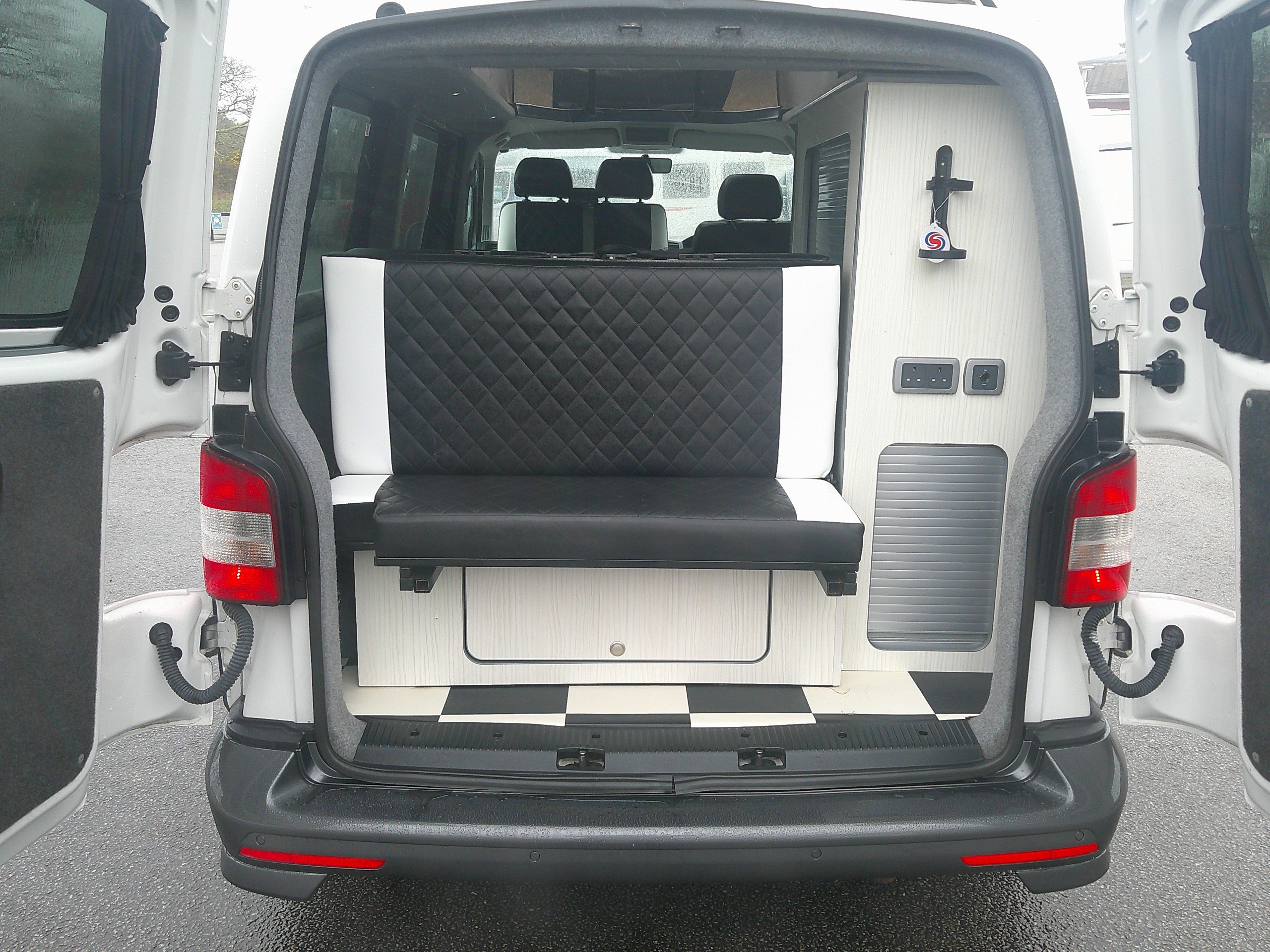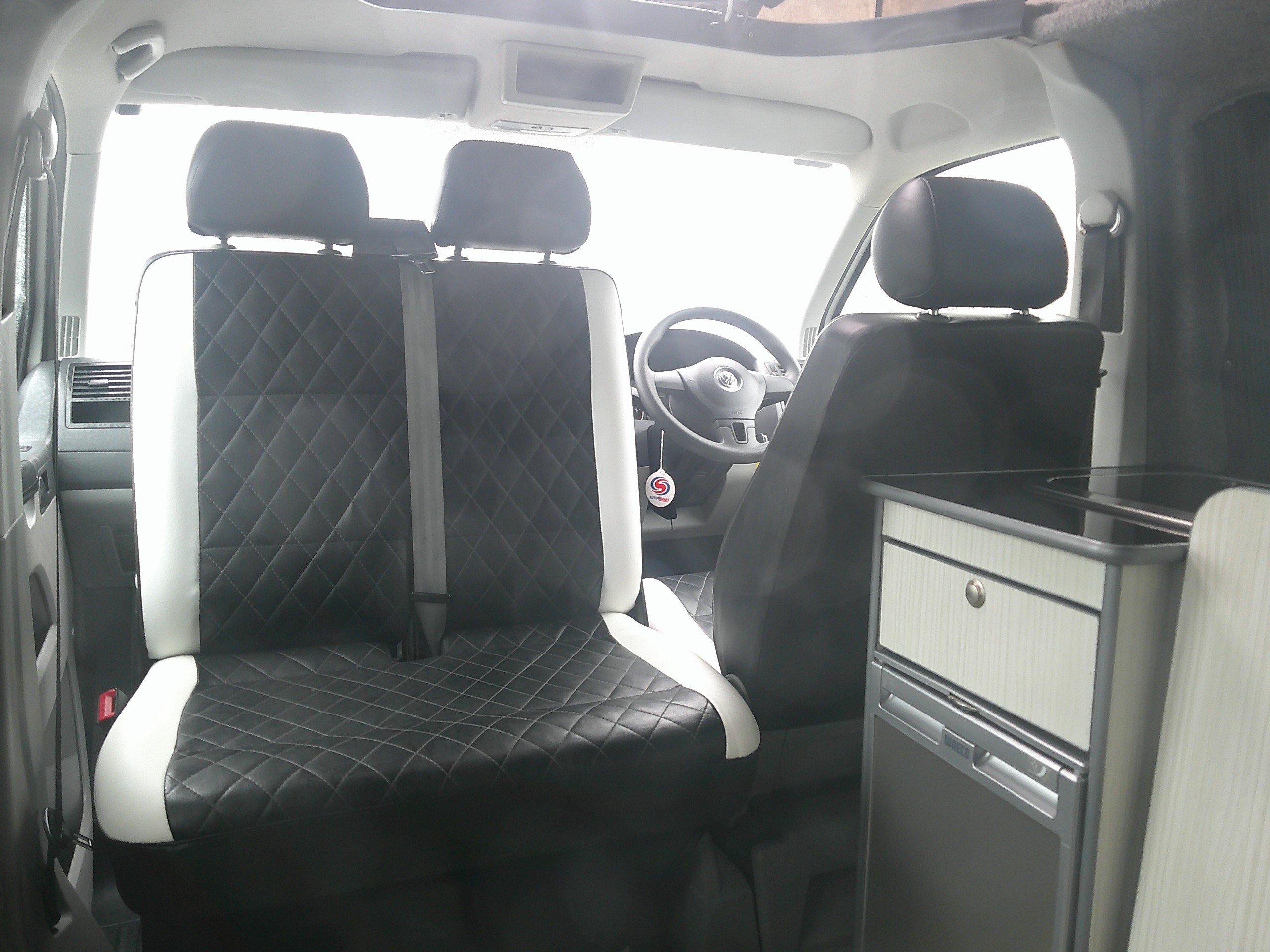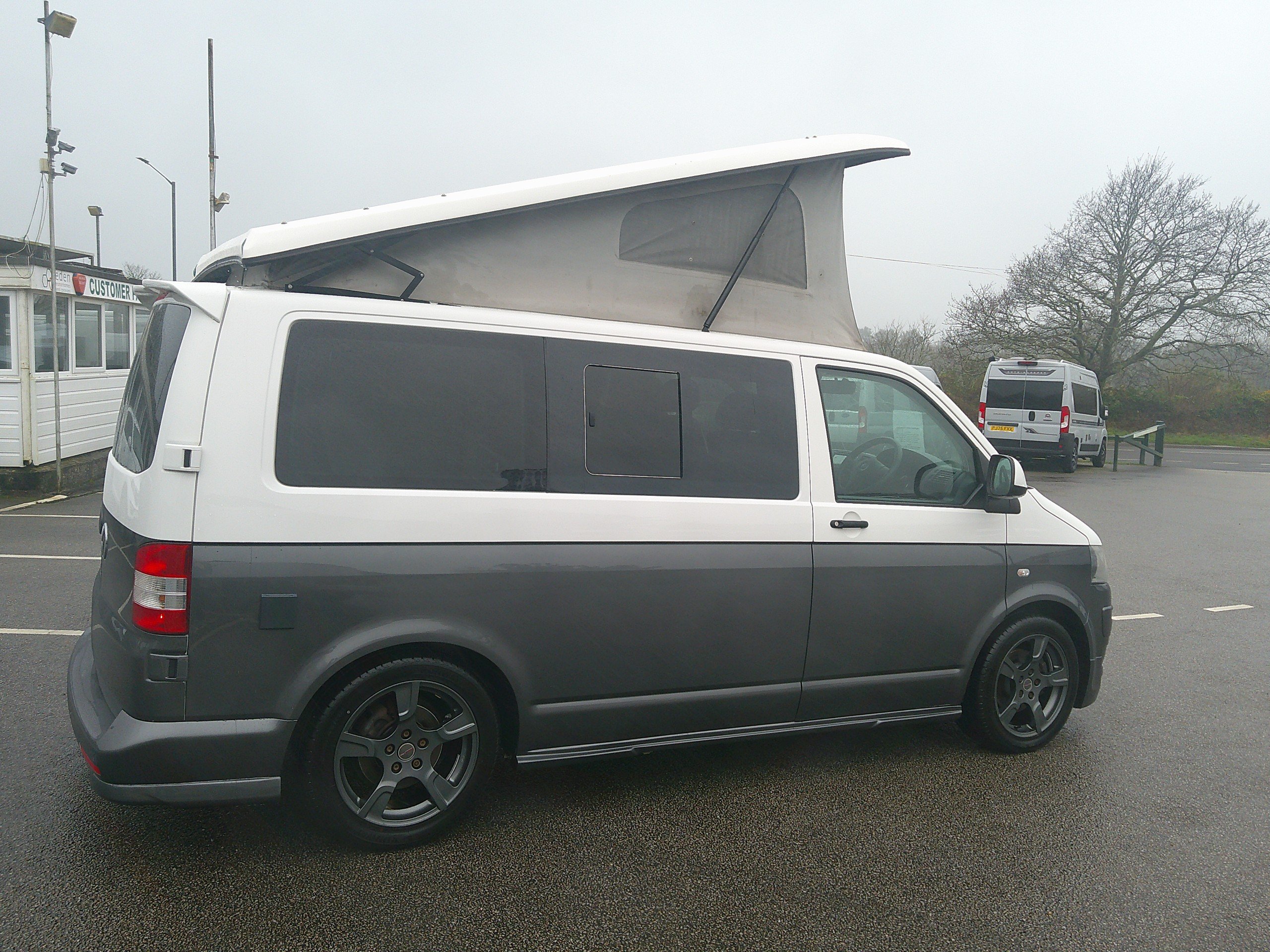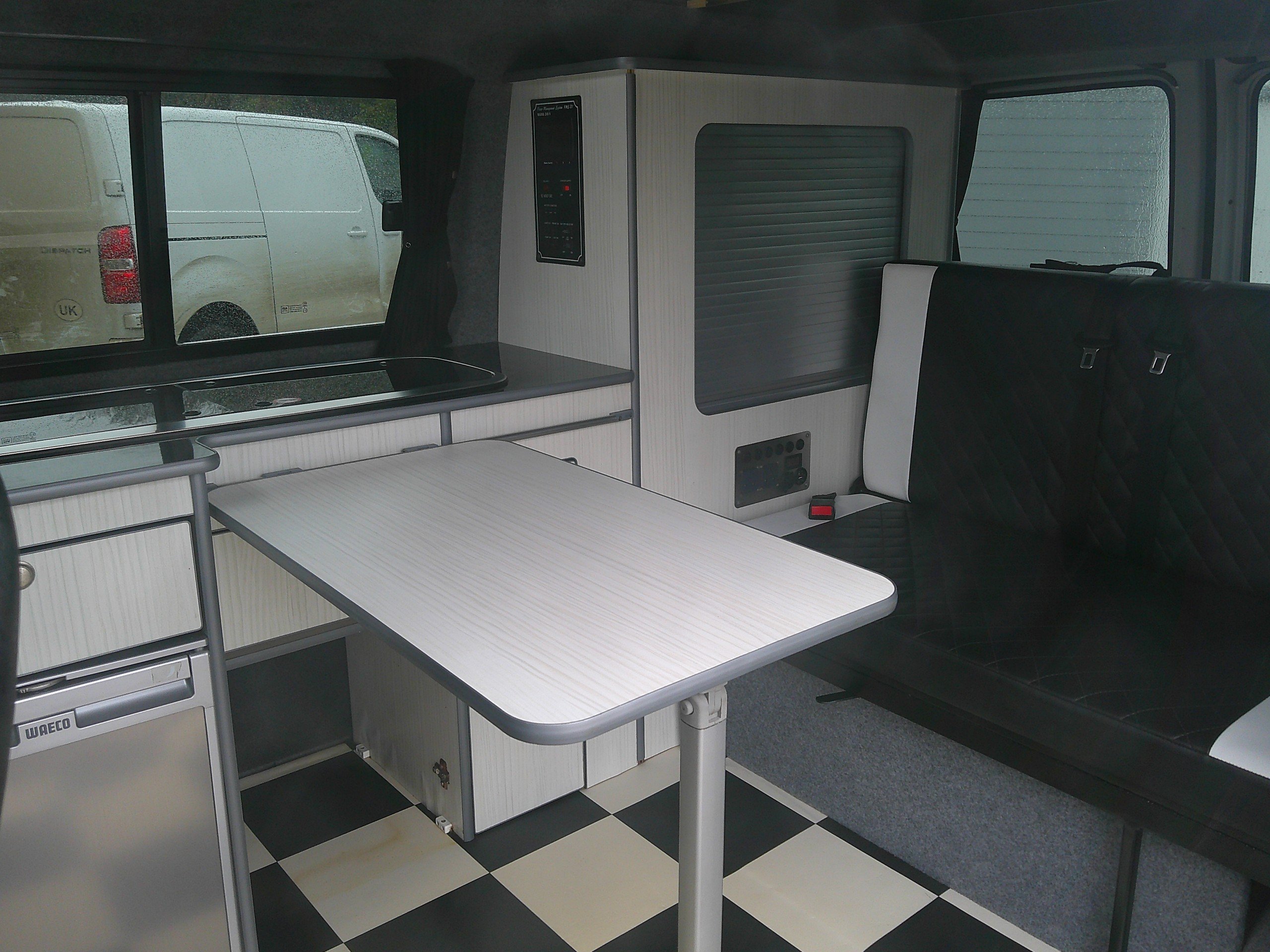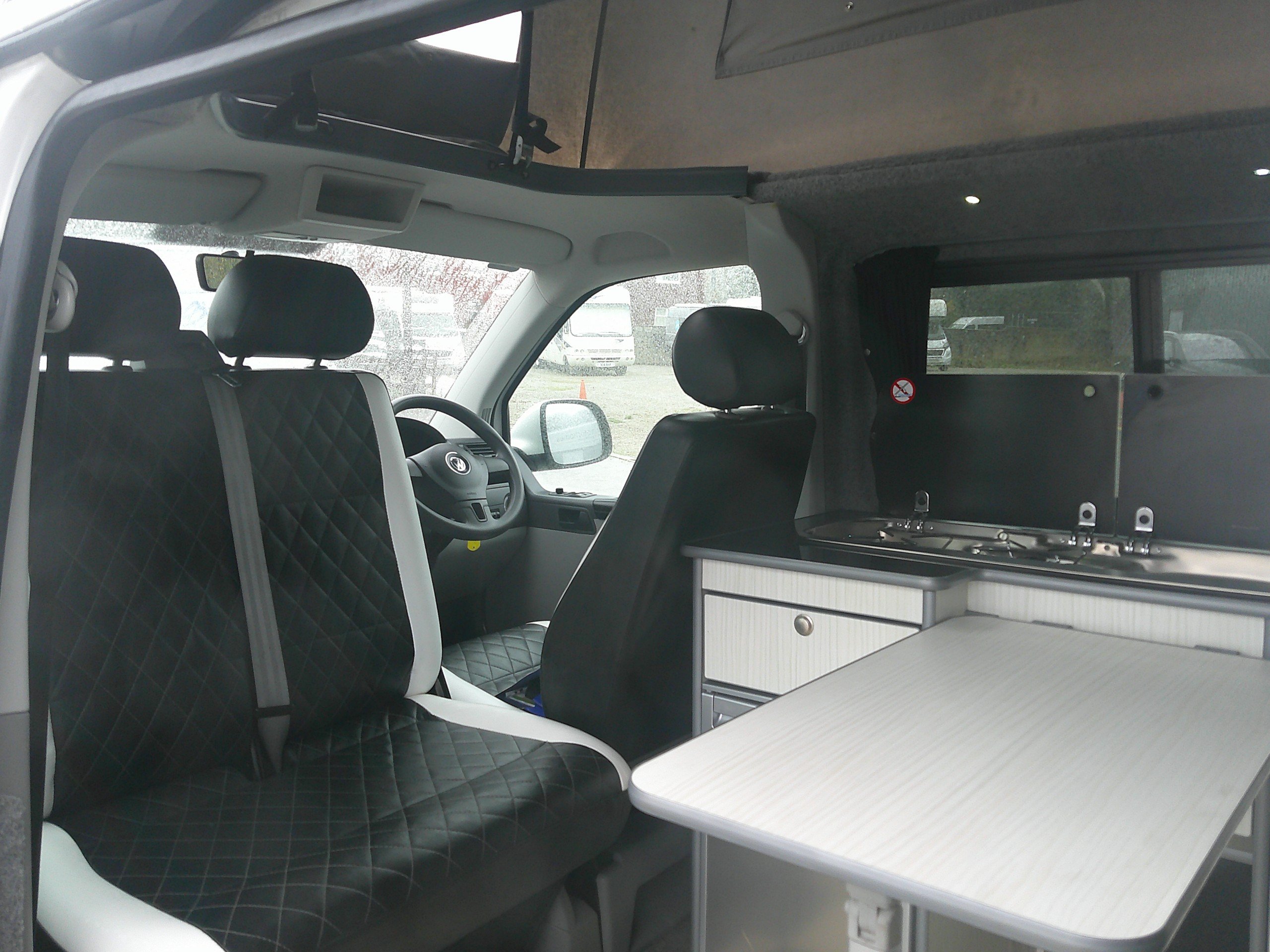 This 4 berth Bigwave campervan conversion is based on the Volkswagen 5 speed manual gearbox. The layout consists of a Rock N Roll bed with 2 rear seatbelts, bed above in the elevating roof, side kitchen, swivel twin front bench seat. The spec consists of a 12 volt fridge, 2 burner hob, sink, water container, control panel, leisure battery, lights, curtains, rear sensors, Android media system, satnav, bluetooth, alloys. -